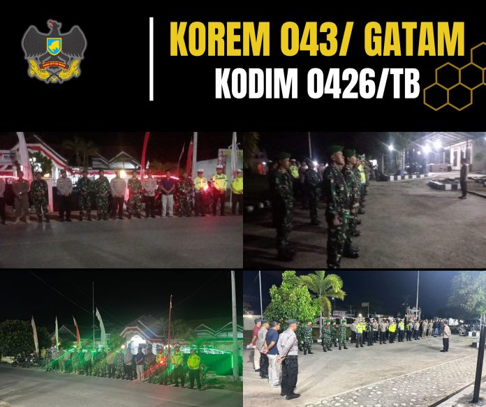 KODIM 0426/TB – – Simpang Pematang (Mesuji) — Kapten Inf Sahroni, Wadanramil 426-01 Simpang Pematang, bersama jajaran Polsek Simpang Pematang melaksanakan patroli gabungan TNI-Polri pada Sabtu malam, 18 Oktober 2025. Kegiatan ini menyasar sejumlah lokasi strategis di Desa Simpang Pematang, Kecamatan Simpang Pematang, Kabupaten Mesuji, guna menciptakan situasi keamanan dan ketertiban masyarakat (Kamtibmas) yang aman dan kondusif.