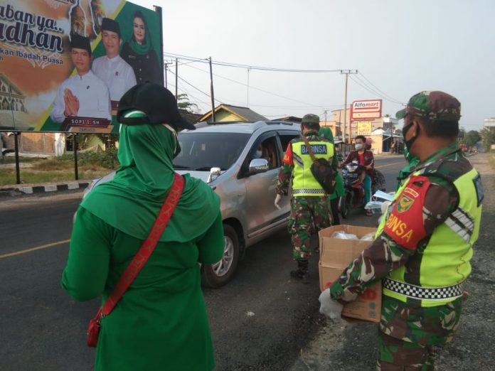 KODIM 0426/TB- TULANG BAWANG- Personel Jajaran Kodim 0426/TB bersama Persit KCK cabang XLIX Kodim 0426/TB melaksanakan kegiatan pembagian takjil untuk berbuka puasa sekaligus pembagian masker sebagai upaya untuk menekan dan menghambat penyebaran Covid 19 di wilayah Tulang Bawang, Senin (19/04/2021)