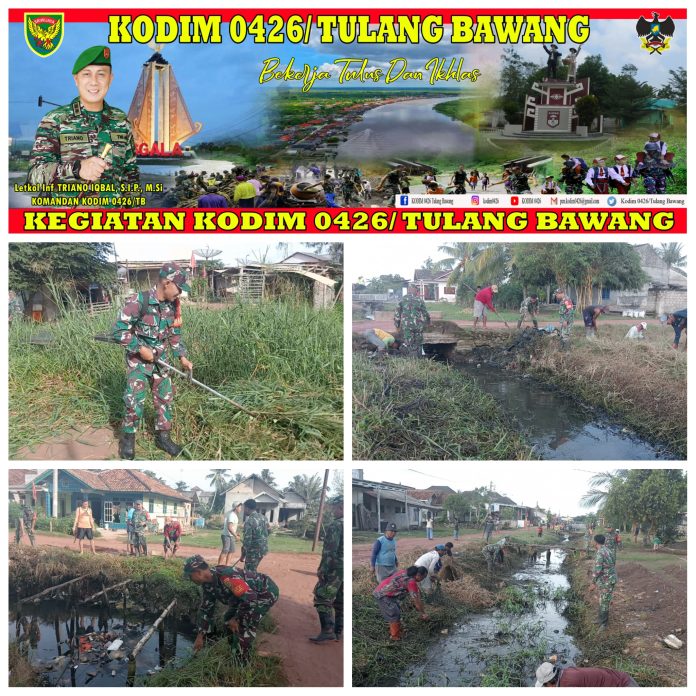 KODIM 0426/TB-Rawajitu Selatan (Tulang Bawang) — Kodim 0426 Tulang Bawang, Melalui Koramil 426-03 Rawajitu, melaksanakan Karya Bakti pembersihan Kanal guna mengantisipasi bencana banjir dan Wabah penyakit DBD, di Kampung Gedung Karya Jitu, Kecamatan Rawajitu Selatan, Kabupaten Tulang Bawang, Selasa 05 Desember 2023.