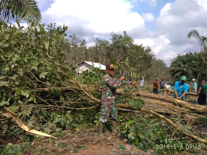 KODIM 0426/TN- PENAWAR AJI– Pelda Suyani, Bintara Tinggi Penghubung (Batibung) Koramil 426-02 Menggala, Kodim 0426 Tulang Bawang, melaksanakan gotong royong pemotongan pohon di RK 04 Kampung Gedung Harapan, Kecamatan Penawar Aji, Kabupaten Tulang Bawang, Senin (7/9/2020)