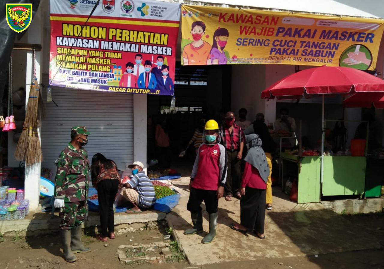 Aparatur Desa, Babinsa dan Anggota Puskesmas Sosialisasikan Penggunaan Masker di Pasar Panggung Jaya