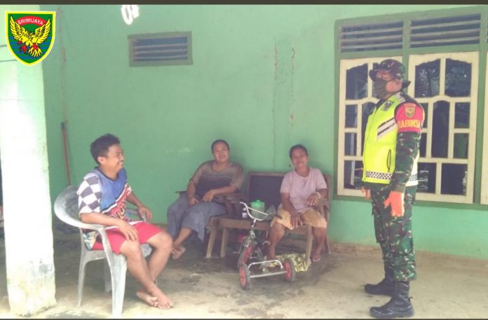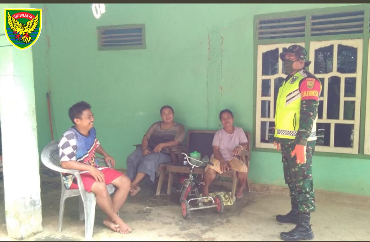 KODIM 0426/TB – MESUJI– Serda Ahmad Najmi, Bintara Pembina Desa (Babinsa) Koramil 426-01 Mesuji, Kodim 0426 Tulang Bawang, keliling Desa dari rumah ke rumah mensosialisasikan pencegahan penularan Covid-19 di Desa Adi Mulyo, Kecamatan Panca Jaya, Kabupaten Mesuji, Selasa (21-04-2020)