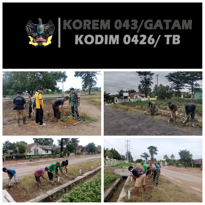 KODIM 0426/TB–Banjar Baru (Tulang Bawang) — Babinsa Koramil 426-02 Menggala, Kodim 0426 Tulang Bawang, Praka Dany gotong-royong bersama Perangkat Desa, membersihkan ruas kanan-kiri jalan yang ditumbuhi dengan rumput liar, bertempat di Kampung Panca Mulya, Kecamatan Banjar Baru, Kabupaten Tulang Bawang, Rabu 30 April 2025.