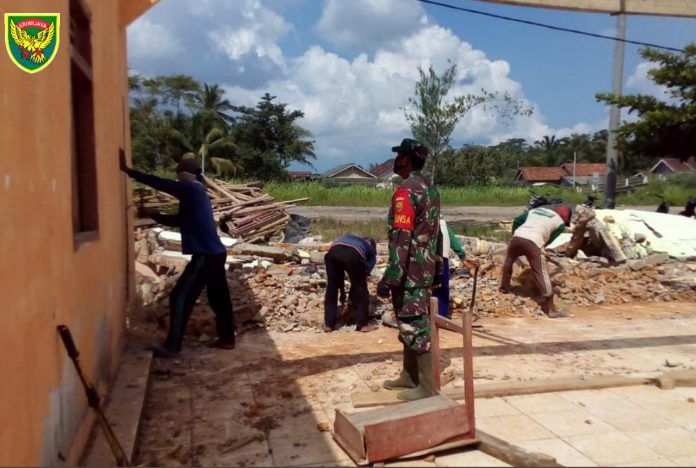 KODIMK 0426/TB – RAWAJITU–Bi Pembina Desa (Babinsa) Koramil 426-03 Rawajitu, Kodim 0426 Tulang Bawang, Sertu Rapinel, Melaksanakan gotong royong rehap Balai Desa Sidang Way Puji, Kecamatan Rawajitu Utara, Kabupaten Mesuji, Rabu (06-05-2020)