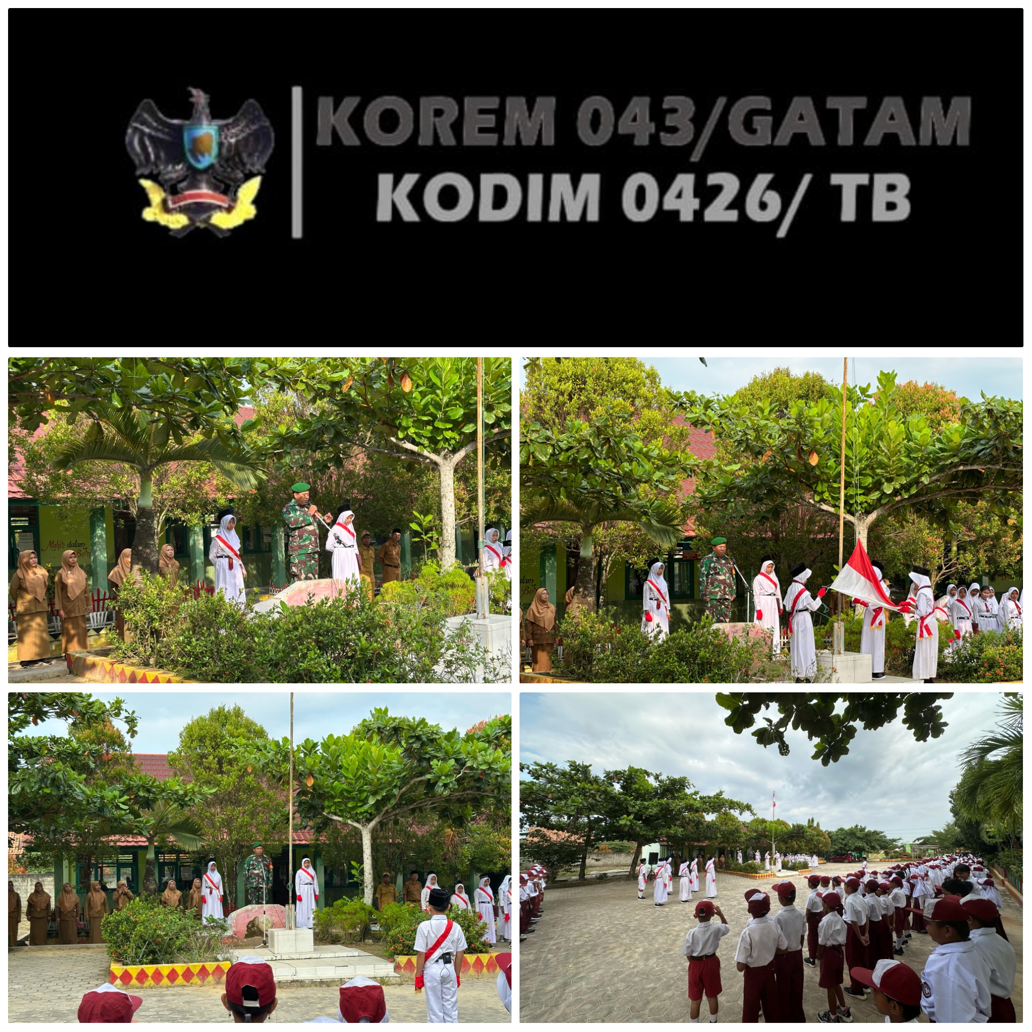 KODIM 0426/TB — Banjar Margo (Tulang Bawang) — Babinsa Koramil 426-04/BA, Kodim 0426 Tulang Bawang, Serka Ngadino, menjadi Pembina Upacara Bendera di SDN 01 Sumber Makmur, Kecamatan Banjar Margo, Kabupaten Tulang Bawang, Senin 28 April 2025.