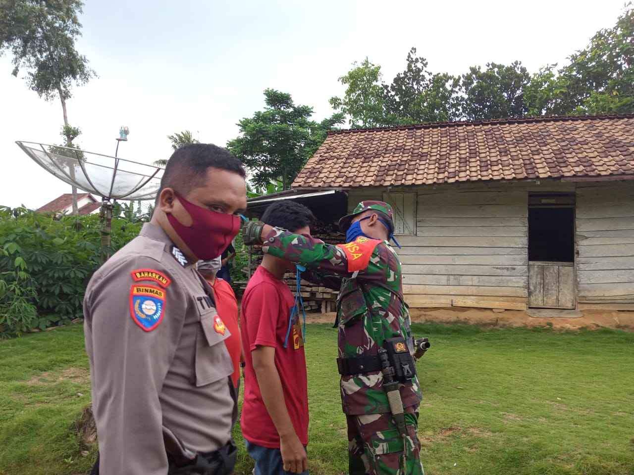 KODIM 0426/TB- TULANG BAWANG– Bertempat di Kampung Warga Makmur Jaya, Kecamatan Banjar Agung, Kabupaten Tulang Bawang, Sertu Sutarto, Bintara Pembina Desa (Babinsa) Koramil 426-02 Menggala, Kodim 0426 Tulang Bawang, dan Bripka Sutino, Babinkamtibmas Polsek Banjar Agung, Polres Tulang Bawang, bersinergi keliling Kampung menghimbau dan memasangkan secara langsung menggunakan masker kepada warga masyarakat dalam beraktifitas di luar rumah.