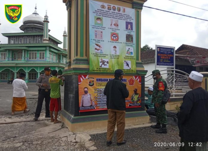 Itulah yang dilakukan oleh Sertu Jainal Panani, Bintara Pembina Desa (Babinsa) Koramil 426-02 Menggala, Kodim 0426 Tulang Bawang dan Bripka Nyoma Djaja, Babinkamtibmas Polsek Banjar Agung, Polres Tulang Bawang, yang tidak kenal lelah menghimbau dan mensosialisasikan protokol kesehatan cegah Covid-19 dengan memasang banner yang hari ini dilaksanakan di Masjid Al- Hidayah Kampung Banjar Dewa, Kecamatan Banjar Agung, Kabupaten Tulang Bawang, Selasa (16-06-2020)