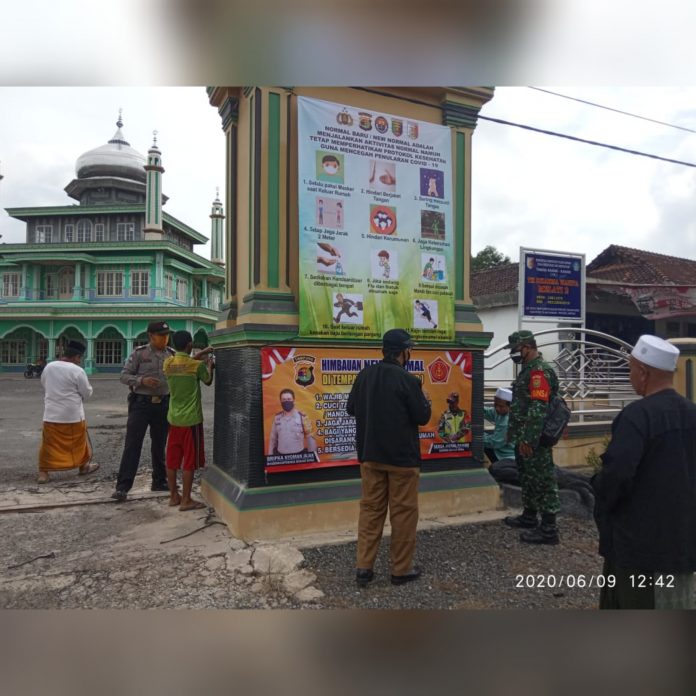 Itulah yang dilakukan oleh Sertu Jainal Panani, Bintara Pembina Desa (Babinsa) Koramil 426-02 Menggala, Kodim 0426 Tulang Bawang dan Bripka Nyoma Djaja, Babinkamtibmas Polsek Banjar Agung, Polres Tulang Bawang, yang tidak kenal lelah menghimbau dan mensosialisasikan protokol kesehatan cegah Covid-19 dengan memasang banner yang hari ini dilaksanakan di Masjid Al- Hidayah Kampung Banjar Dewa, Kecamatan Banjar Agung, Kabupaten Tulang Bawang, Selasa (16-06-2020)