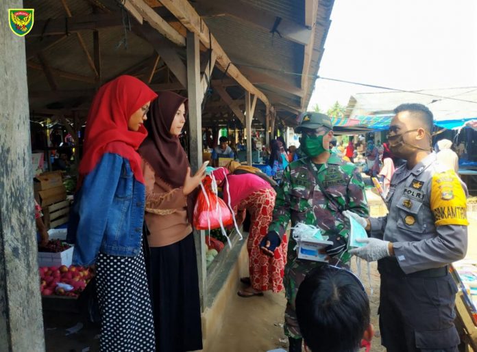 Babinsa dan Babinkamtibmas Sosialisasikan Penggunaan Masker di Pasar Brabasan.