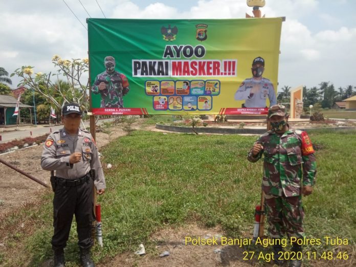Tidak terkecuali Serda Jainal Panani, Bintara Pembina Desa (Babinsa) Koramil 426-02 Menggala, Kodim 0426 Tulang Bawang dan Bintara Pembina Keamanan dan Ketertiban Masyarakat (Babinkamtibmas) Bripka Nyoman Djaja, Polsek Banjar Agung, Polres Tulang Bawang, bersinergi memasang baner himbauan protokol kesehatan “AYO PAKAI MASKER” untuk warga masyarakat binaan di Lapangan Kampung Banjar Dewa, Kecamatan Banjar Agung, Kabupaten Tulang Bawang, Minggu (30/8/2020)