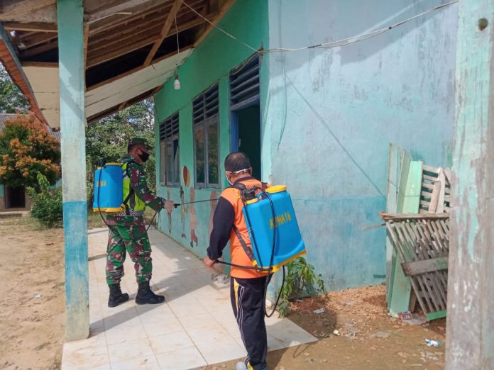 Babinsa Koramil 426-01 Gotong Royong Semprot Desinfektan di Adi Jaya.