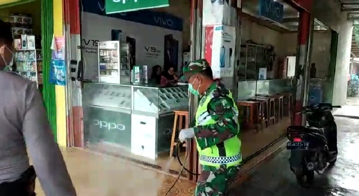 KODIM 0426/TB – MESUJI– Bintara Pembina Desa (Babinsa) Koramil 426-01/Mesuji, Kodim 0426/Tulang Bawang, Serda Madsudin bersama Babinkamtibmas bantu aparatur Desa Semprot Desinfektan di Pasar Simpang Pematang sebagai usaha Pencegahan Covid-19, Minggu (05/04/2020)