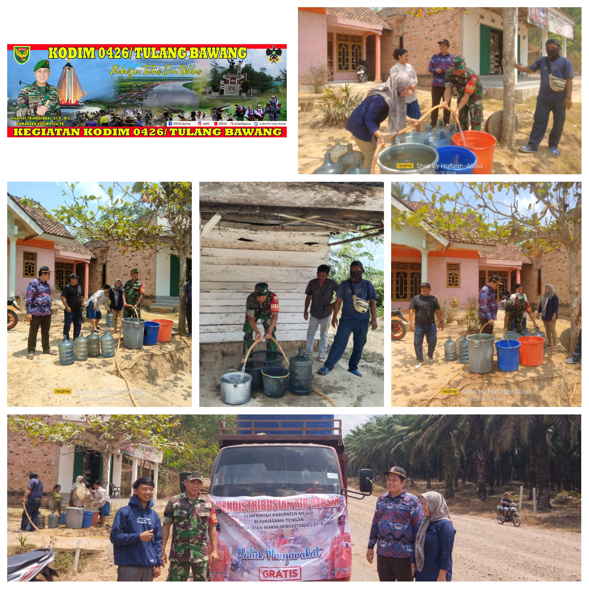 Dalam penyaluran bantuan air bersih tersebut, Babinsa Serka Sumarno memberikan pendampingan bersama-sama dengan PT BSMI.