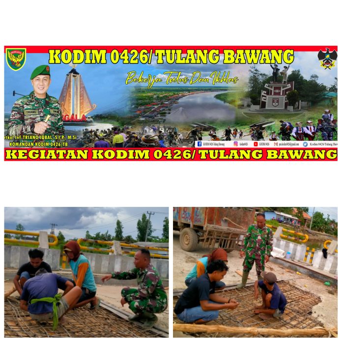 KODIM 0426/TB- (Mesuji Timur)–Serda Puji Riyadi Babinsa Koramil 426-01 Simpang Pematang Melaksanakan Gotong Royong Bersama warga RK 03 melaksanakan perbaikan jalan mengeyam besi untuk pengecoran jembatan yang rusak agar dapat di lalui warga kembali dengan lancar dan aman di Desa Tanjung Mas Jaya Kec. Mesuji Timur Kab. Mesuji, Jum’at 08 Desember 2023.