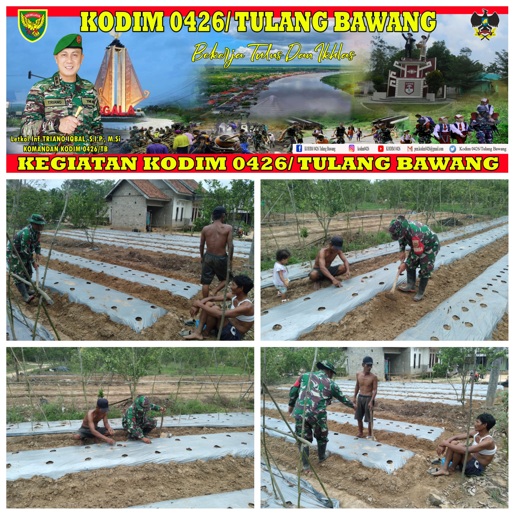 KODIM 0426/TB-Way Serdang (Mesuji) — Babinsa Koramil 426-01 Simpang Pematang, Kodim 0426 Tulang Bawang, Koptu Dedi membantu petani menanam tanaman terong di Desa Labuhan Batin, Kecamatan Way Serdang, Kabupaten Mesuji, Selasa 05 Desember 2023.