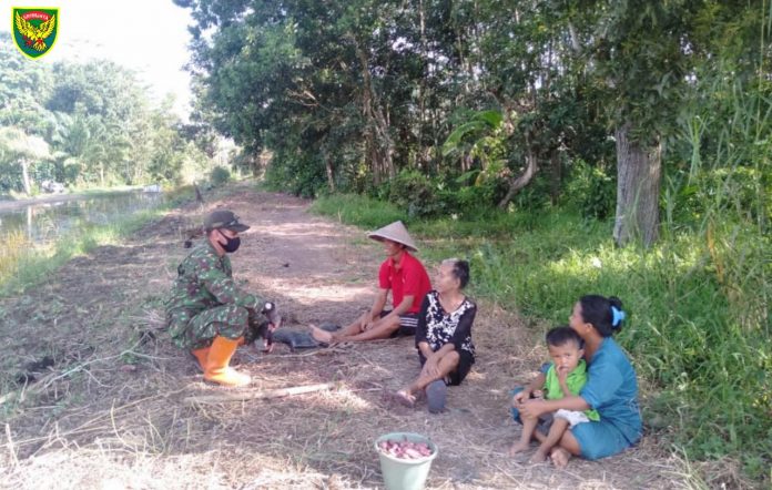 KODIM 0426/TB – RAWAJITU UTARA– Bintara Pembina Desa (Babinsa) Koramil 426-03 Rawajitu, Kodim 0426 Tulang Bawang, Sertu Johanes, melaksanakan anjangsana komunikasi sosial dengan warga masyarakat binaan di Desa Sidang Makmur, Kecamatan Rawajitu Utara, Kabupaten Mesuji, Senin (18-05-2020)