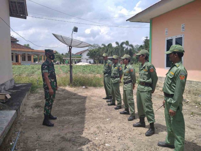 KODIM 0426/TB- Banjar Agung (Tulang Bawang) – Babinsa Koramil 426-04 Banjar Agung, Kodim 0426 Tulang Bawang, Serda Hari Susanto, memberikan pembekalan Wawasan Kebangsaan dan melatih baris berbaris kepada anggota Linmas yang ada di Kampung Banjar Dewa, Kecamatan Banjar Agung, Kabupaten Tulang Bawang, Selasa (01/11/2022).