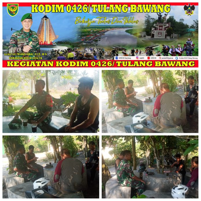 KODIM 0426/TB-Gedung Aji Baru (Tulang Bawang) — Babinsa Koramil 426-04 Banjar Agung, Kodim 0426 Tulang Bawang, Sertu Sutrisno Wibowo, melaksanakan komunikasi sosial merangkul warga binaan dalam rangka memperkokoh Kemanunggalan TNI denga Rakyat. berkomunikasi sosial dengan warga binaan, di Kampung Batu Ampar, Kecamatan Gedung Aji Baru, Kabupaten Tulang Bawang, Minggu 03 Desember 2023.