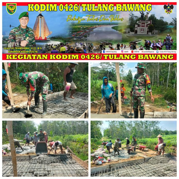 KODIM 0426/TB-Banjar Agung (Tulang Bawang) — Babinsa Koramil 426-04 Banjar Agung Kodim 0426 Tulang Bawang Sertu Suranto dalam upaya membantu kesulitan warga binaannya melaksanakan gotong royong bersama membangun jembatan untuk mempermudah warga menuju Ladang Perkebunan di Kampung Banjar Agung, Kecamatan Banjar Agung, Kabupaten Tulang Bawang, Selasa 19 September 2023.