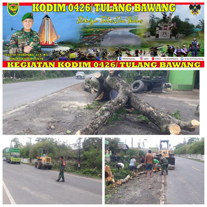 Babinsa Koramil 426-04 Banjar Agung Bersama Warga Membersihkan Pohon Tumbang Di Jalan