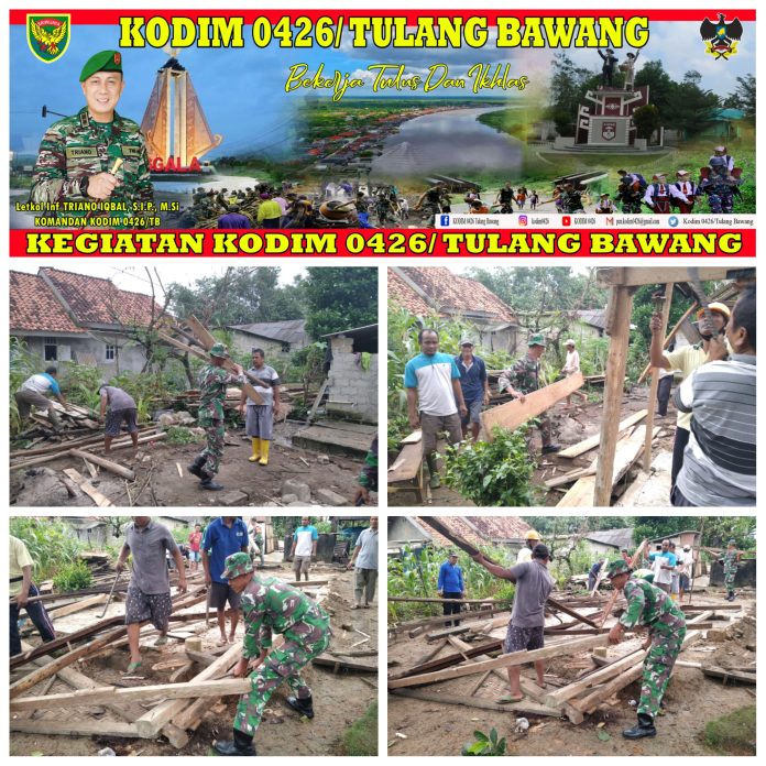KODIM 0426/TB- Banjar Agung (Tulang Bawang) — Babinsa Koramil 426-04 Banjar Agung, Kodim 0426 Tulang Bawang, Sertu Heri bersama warga masyarakat setempat membantu perbaikan rumah Warganya di Kampung Mukti Jaya, Kecamatan Banjar Agung, Kabupaten Tulang Bawang, 26 November 2023.