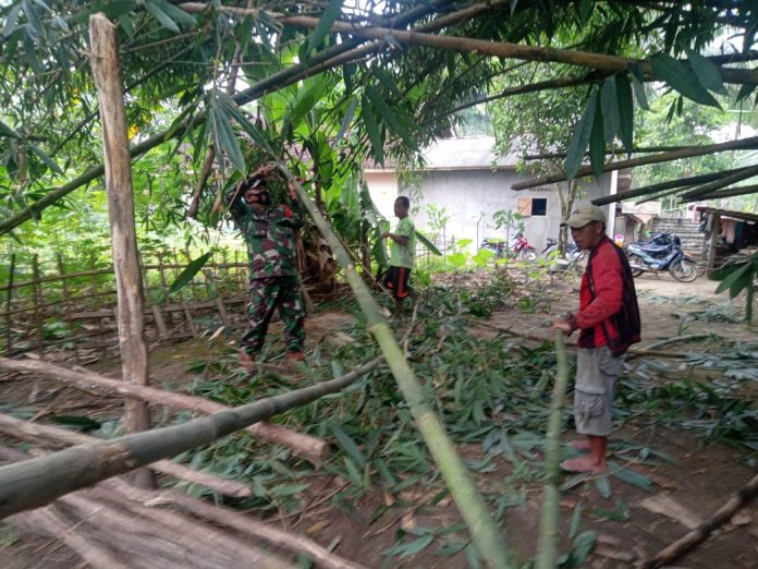 KODIM 0426/TB- TULANG BAWANG–Sertu Ngadino, Bintara Pembina Desa (Babinsa) Koramil 426-04 Banjar Agung, Kodim 0426 Tulang Bawang, gotong royong bersama warga masyarakat potong bambu di Kampung Sumber Makmur, Kecamatan Banjar Margo, Kabupaten Tulang Bawang,Jum’at (9/10/2020)