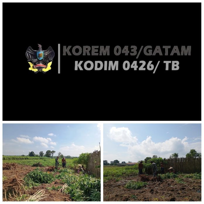 KODIM 0426/TB–Meraksa Aji (Tulang Bawang) — Babinsa Koramil 426-05/PA, Kodim 0426 Tulang Bawang, membantu petani panen singkong atau ketela pohon milik bapak Sukamdi di Kampung Karya Bakti, Kecamatan Meraksa aji, Kabupaten Tulang Bawang, Minggu 19 Mei 2024.