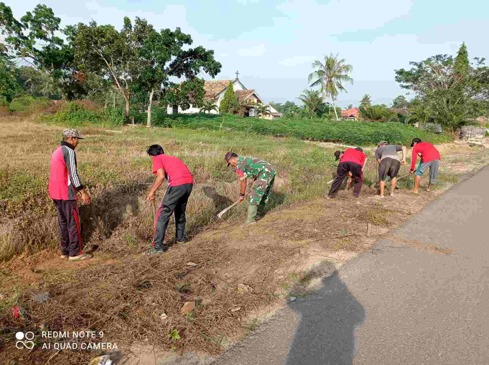 KODIM 0426/TB- Babinsa Gedung Harapan, Kecamatan Penawar Aji, Kabupaten Tulang Bawang, Peltu Suyani kompak bersama masyarakat gotong royong bersihkan lingkungan, Minggu 24 Juli 2022.