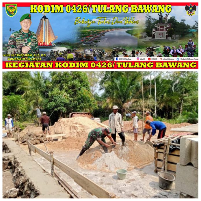 KODIM 0426/TB- Babinsa Koramil 426-05 Penawar Aji Kodim 0426 Tulang Bawang Sertu Siswanto membantu meringankan pekerjaan masyarakat yang sedang membangun rumah, Dikampung Aji Jaya KNPI, Kecamatan Gedung Aji, Kabupaten Tulang Bawang, Sabtu 08 Juli 2023.