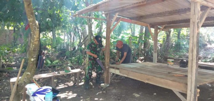 KODIM 0426/TB- Rawapitu (Tulang Bawang) – Babinsa Koramil 426-05 Penawar Aji, Kodim 0426 Tulang Bawang, Sertu Asti bersama masyarakat gotong royong memperbaiki poskamling dan membersihkan rumput yang berada di seputaran pos, yang berada di Kampung Duta Yuso Mulyo, Kecamatan Rawapitu, Kabupaten Tulang Bawang, Kamis (1/12/2022).