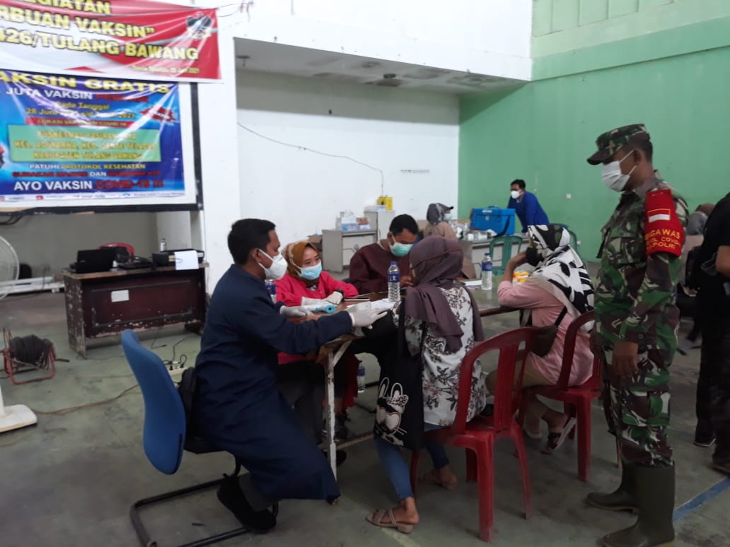KODIMeKODIM 0426T/TB- (Tulang Bawang) — Babinsa Koramil 426-02 Menggala, Kodim 0426 Tulang Bawang, Serda Priyo Santoso, kawal proses vaksinasi massal Covid-19 di Kampung Adiwarna, Kecamatan Dente Teladas, Kamis, 15 Juli 2021.
