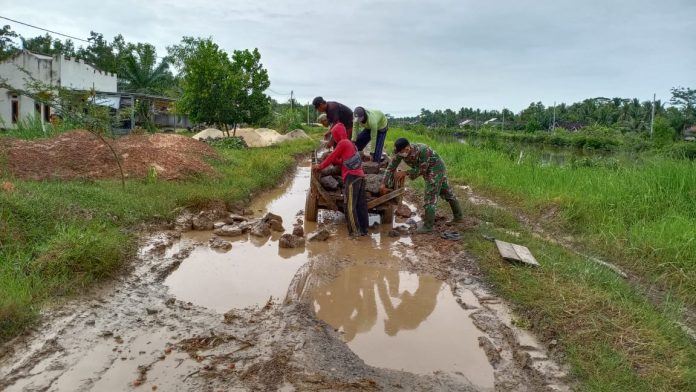 Babinsa Koramil Rawajitu Bersama Warga Timbun Jalan Rusak.
