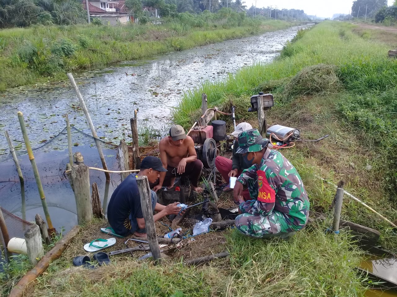KODIM 0426/TB- RAWAJITU- Anggota Koramil 426-03 Rawajitu, Kodim 0426 Tulang Bawang memantau langsung petani yang sedang mengairi sawah dalam tanam musim gadu di Desa Sidang Bandar Anom, Kecamatan Rawajitu Utara, Kabupaten Mesuji, Jumat 4 Juni 2021.