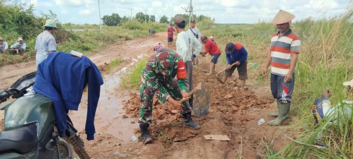KODIM 0426/TB- TULANG BAWANG- Serda Priyo Santoso bergerak cepat bersama masyarakat kampung Pasiran Jaya, Kecamatan Dente Teladas melakukan perbaikan badan jalan, Rabu 2 Juni 2021.
