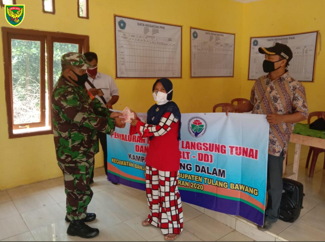 KODIM 0426/TB – TULANG BAWANG– Aparatur Kampung Agung Dalam, Kecamatan Banjar Baru, Kabupaten Tulang Bawang melaksanakan Pembagian Bantuan Langsung Tunai (BLT) kepada warga masyarakatnya yang terdampak Coronavirus disease 2019 (Covid-19) hari ini Rabu, 20 Mei 2020 di Balai Kampung.