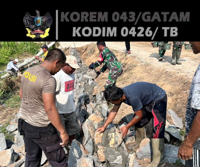 KODIM 0426/TB – – Pembangunan tanggul cor yang menjadi bagian dari sasaran fisik TMMD ke-125 Kodim 0426/Tulang Bawang terus dikerjakan secara intensif. Berlokasi di Kampung Moris Jaya, Kecamatan Banjar Agung, tanggul ini dirancang untuk menahan sisi jalan agar tidak mudah longsor dan tergerus air hujan.