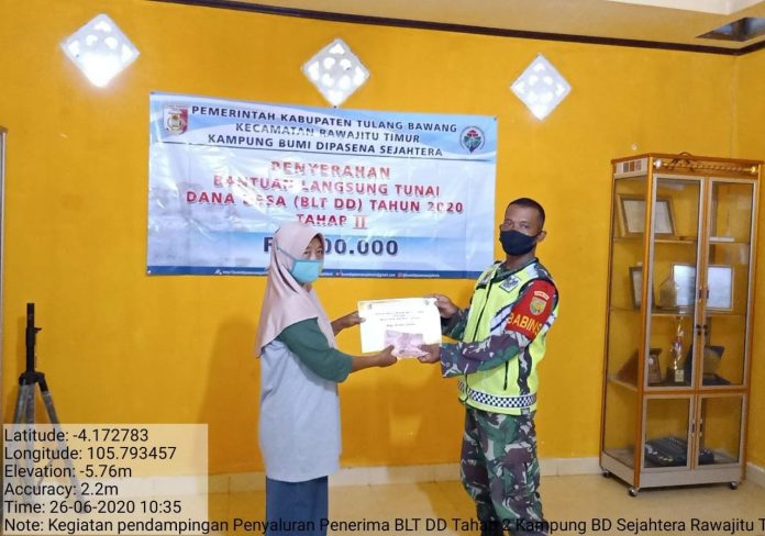 KODIM 0426/TB- TULANG BAWANG–Kegiatan penyaluran Dana Bantuan Langsung tunai ( BLT-DD) Tahap- II di Kampung Bumi Dipasena Sejahtera Kecamatan Rawajitu Timur Kabupaten Tulang Bawang, Jum’at (26-06-2020)
