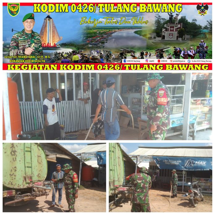 KODIM 0426/TB- Panca Jaya (Mesuji) — Jajaran Koramil 426-01 Simpang Pematang, Kodim 0426 Tulang Bawang, salurkan air bersih kepada masyarakat di Desa Mukti Karya, Kecamatan Panca Jaya, Mesuji, Senin 18 September 2023.