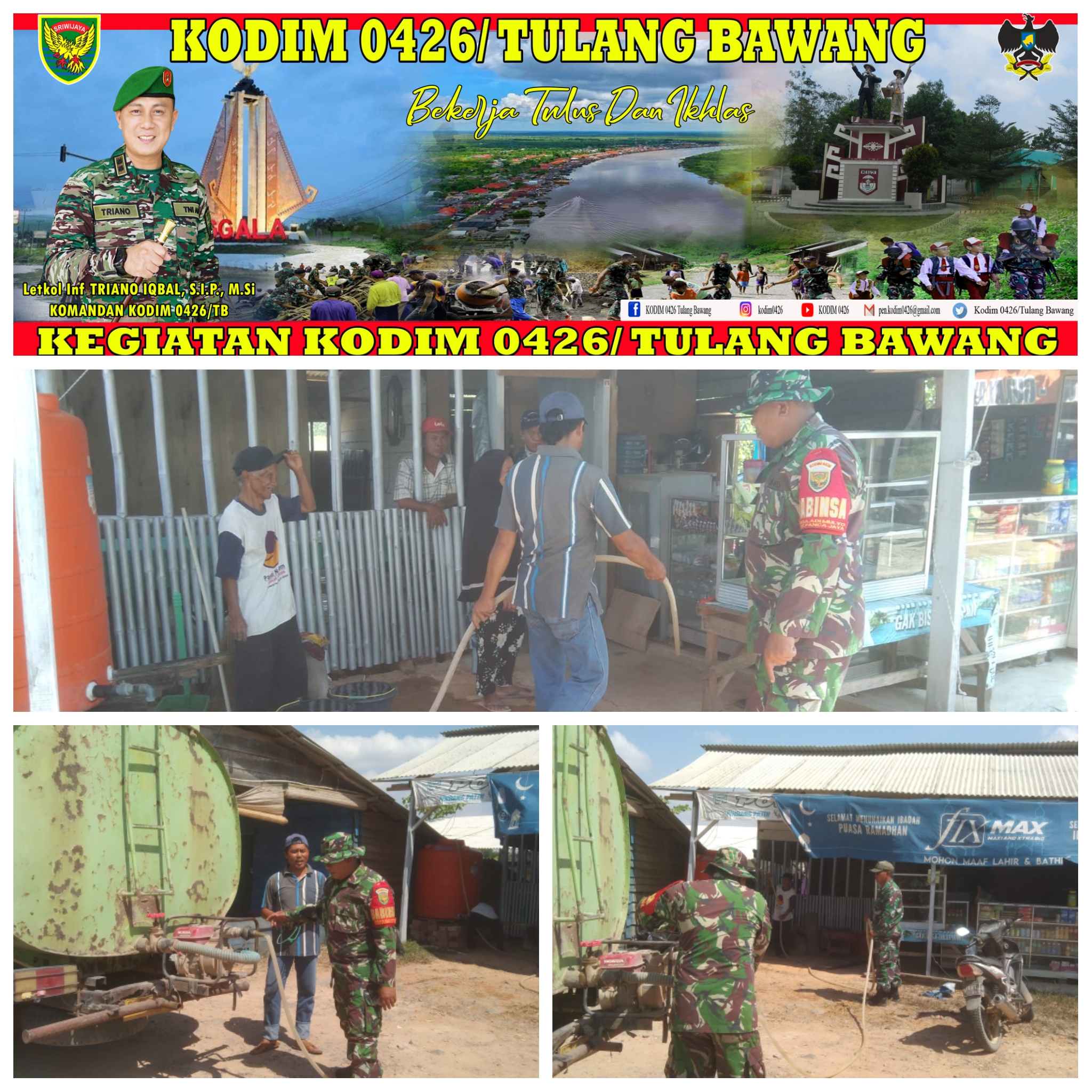Caption. Jajaran Koramil Mesuji bersama pihak perusahaan salurkan air bersih.