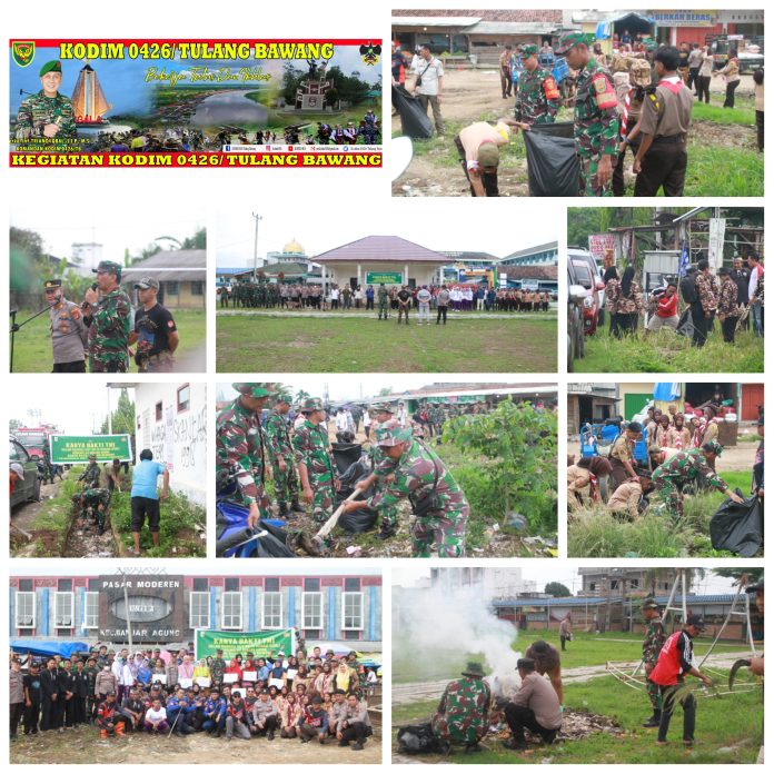 Personel Koramil 426-04 Banjar Agung menggelar karya bakti membersihkan kawasan Pasar Modern Unit ll Banjar Agung, Tulangbawang, Kamis, 7 Desember 2023.