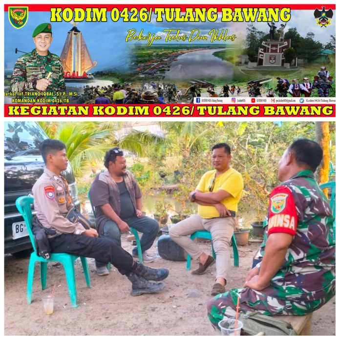 KODIM 0426/TB- Rawajitu Utara- Dalam rangka upaya mengeratkan hubungan dengan perangkat desa dan tokoh masyarakat, Babinsa Koramil 426-03/Rawajitu Serda Ludin bersama Bhabinkamtibmas melaksanakan Anjangsana bersama warga bapak muslimin di RT 01 Rk 02 di desa Sungai Buaya Kec. Rawajitu Utara Kab.Mesuji, Rabu (30/08/2023).