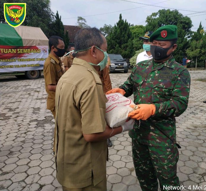 KODIM 0426/TB – MENGGALA- Komandan Kodim 0426 Tulang Bawang Letkol Inf Kohir mendampingi Bupati Tulang Bawang Hj. Winarti berikan bantuan Sembako secara simbolis untuk masyarakat yang terdampak Covid-19 di Kabupaten Tulang Bawang, Senin (04/05/20).