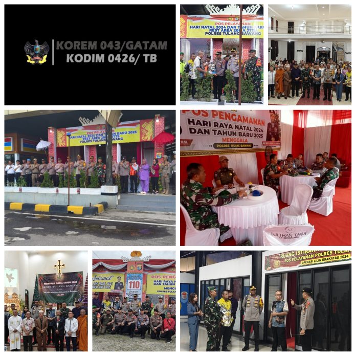 KODIM 0426/TB-Jajaran Forkopimda Kabupaten Tulang Bawang, melakukan monitoring ke sejumlah Gereja dan Pos Pengamanan pada malam Natal untuk memastikan perayaan Natal dan pelaksanaan ibadah menyambut Hari Raya Natal berjalan aman, Selasa 24 Desember 2024.