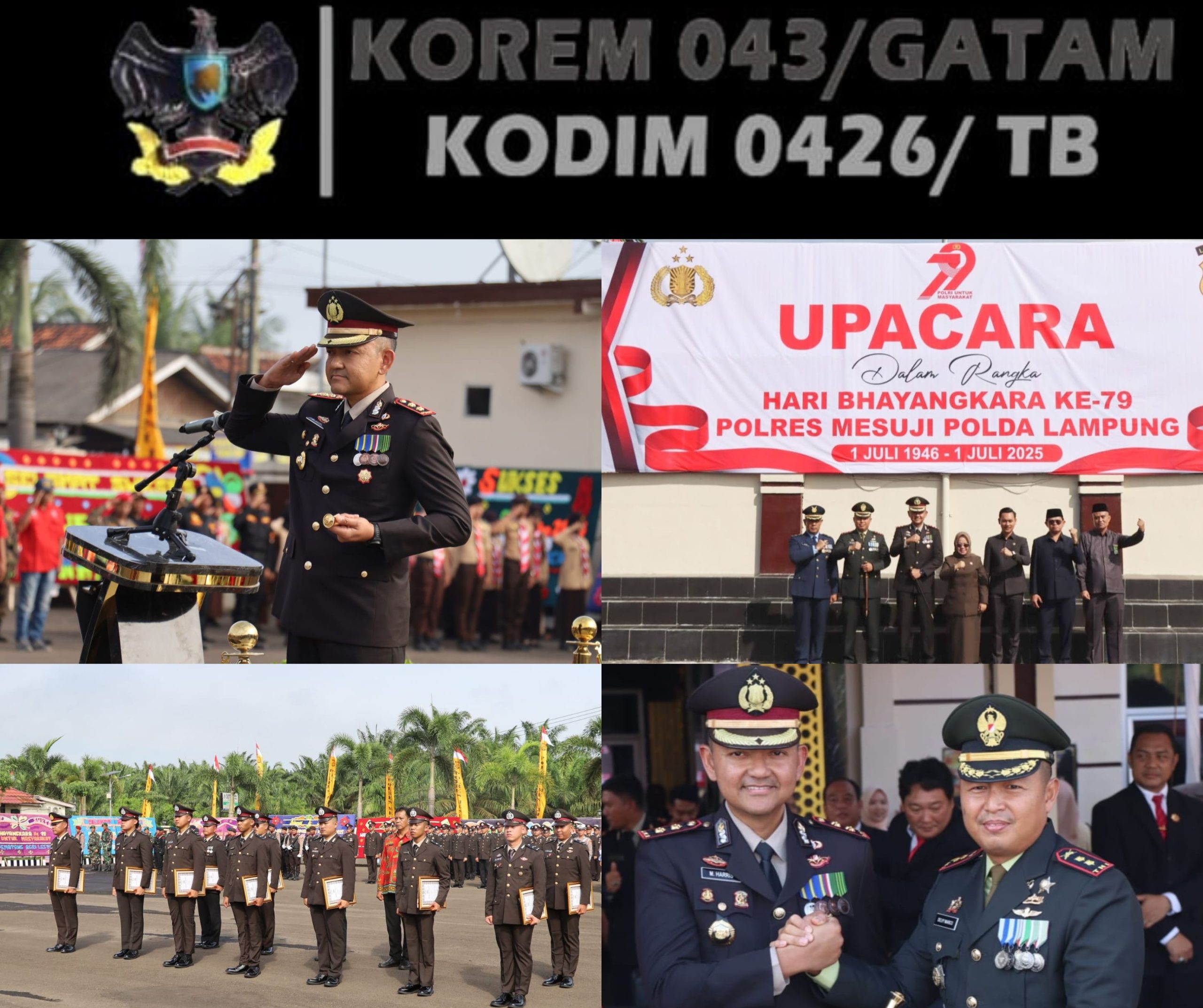 KODIM 0426/TB – – Simpang Pematang (Mesuji) — Komandan Kodim 0426 Tulang Bawang, Letkol Kav Delvy Marico, S.E., M.I.P., menghadiri upacara dan syukuran dalam rangka peringatan Hari Ulang Tahun (HUT) Ke-79 Bhayangkara yang digelar di halaman Mapolres Mesuji, Jalan Lintas Timur KM 192, Desa Wira Bangun, Kecamatan Simpang Pematang, Kabupaten Mesuji, Selasa 01 Juli 2025. Perayaan tahun ini mengusung tema “*Polri untuk Masyarakat*.”