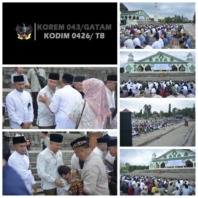 KODIM 0426/TB– Menggala (Tulang Bawang) — Komandan Kodim 0426 TB Letkol Kav Delvy Marico, S.E., M.I.P. bersama Bupati dan unsur Forkompinda Tulang Bawang serta ribuan masyarakat melaksanakan sholat Idul Fitri 1446H/2025 bertempat di Masjid Agung Baiturahman Islamic Center, Kabupaten Tulang Bawang, Senin 31 Maret 2025.