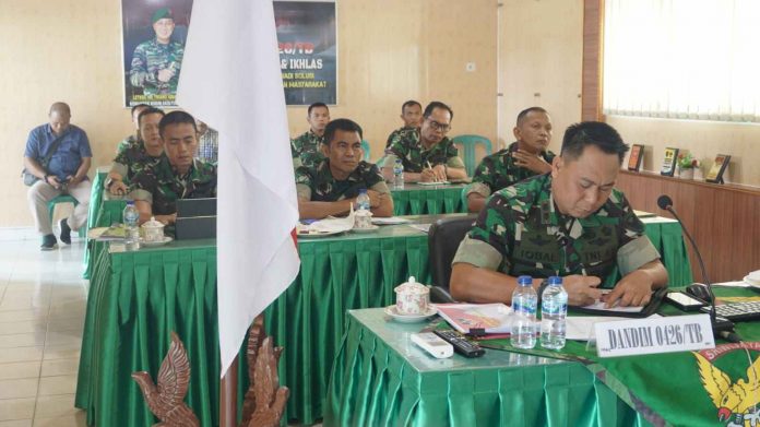 KODIM 0426/TB- Komandan Kodim 0426 Tulang Bawang Letkol Inf Triano Iqbal,S I.P.,M.Si menerima arahan langsung dari Kasad Jenderal TNI DR. Dudung Abdurachman, S.E., M.M melalui video confrence (Vicon) di Makodim 0426, Kampung Bujung Tenuk, Kecamatan Menggala, Kabupaten Tulang Bawang, Senin 12 September 2022.