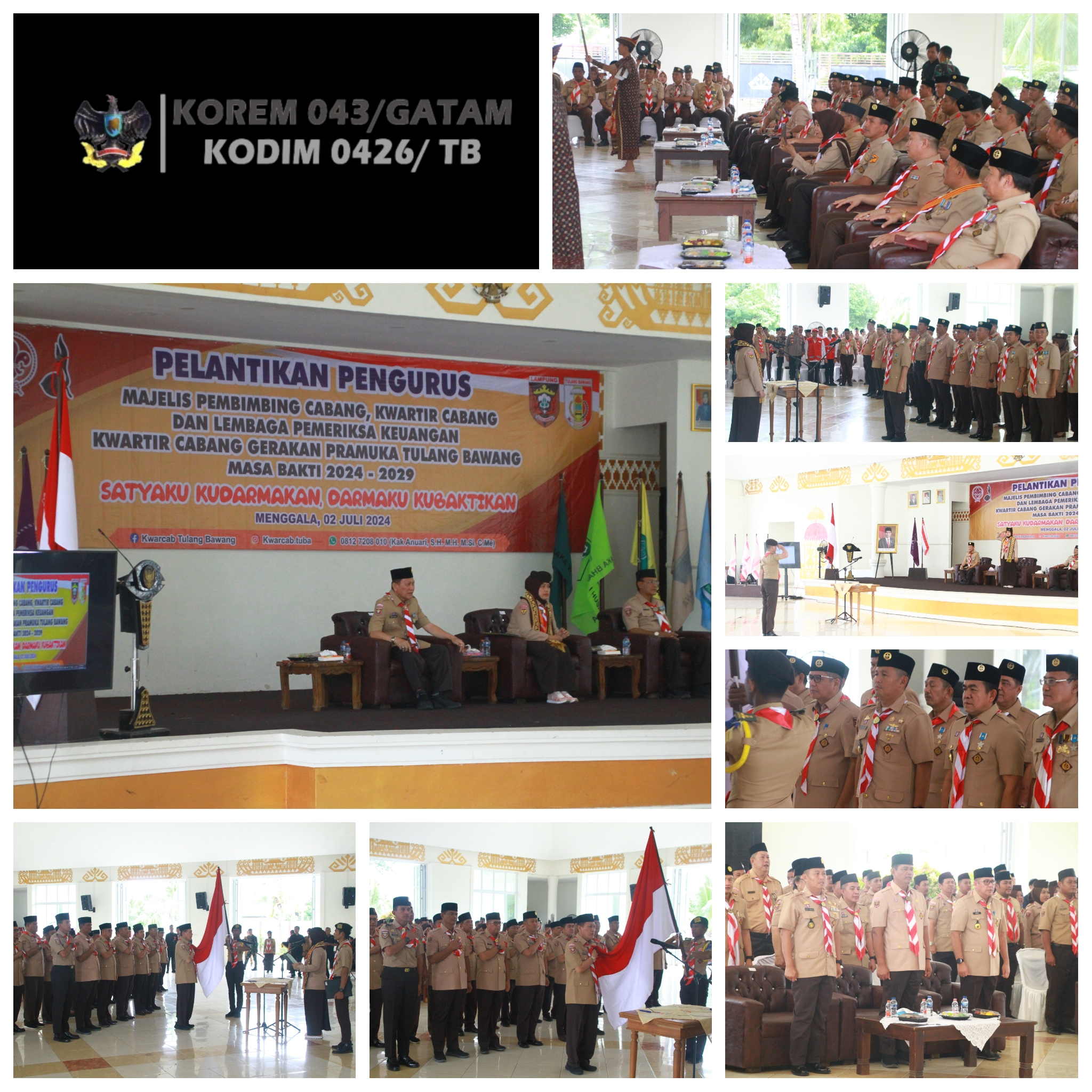 KODIM 0426/TB-Komandan Kodim 0426 Tulang Bawang Letkol Kav Delvy Marico, S.E., M.I.P. Hadiri pelantikan Mabicap, Kwarcab dan LPK Gerakan Pramuka Masa Bakti 2024-2029 oleh PJ Bupati Tulang Bawang, Qudrotul Ikhwan, Selasa 2 Juli 2024.