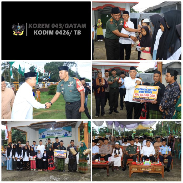 KODIM 0426/TB — Gedung Meneng (Tulang Bawang) — Komandan Kodim 0426 Tulang Bawang, Letkol Kav Delvy Marico, S.E., M.I.P, yang diwakili Danramil 426-02 Menggala Kapten Inf Hasin mengikuti kegiatan bersama Forkopimda Tulang Bawang, laksanakan safari Ramadhan bertempat di Masjid Al Ikhlas, Kampung Bakung Rahayu, Kecamatan Gedung Meneng, Kabupaten Tulang Bawang, Selasa malam, 11 Maret 2025.