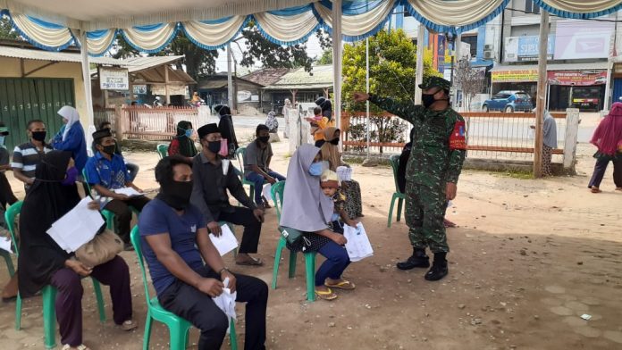 KODIM 0426/TB- TULANG BAWANG– Komandan Koramil (Danramil) 426-02 Menggala, Kodim 0426 Tulang Bawang, Kapten Inf LE Sihombing, pantau langsung pelaksanaan penyaluran BST (Bantuan Sosial Tunai) dari Kemensos untuk warga masyarakat terdampak Coronavirus disease 2019 (Covid-19) di Kantor Pos Unit- 2 Banjar Agung, Kabupaten Tulang Bawang, Senin (13/7/2020)