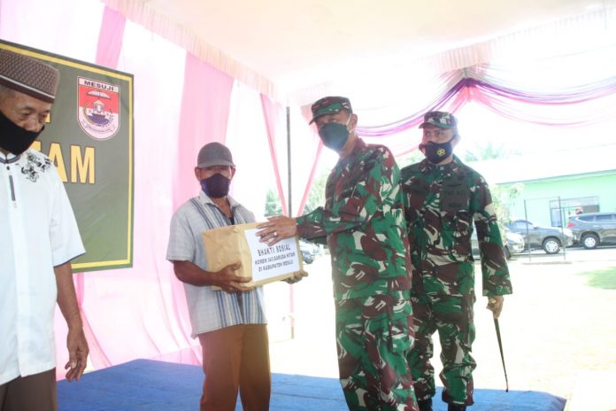 KODIM 0426/TB- Komandan Korem 043 Garuda Hitam Brigjen TNI Drajad Brima Yoga bagikan bantuan sosial kepada masyarakat di Makoramil 426-01 Simpang Pematang, Sabtu 30 Oktober 2021.